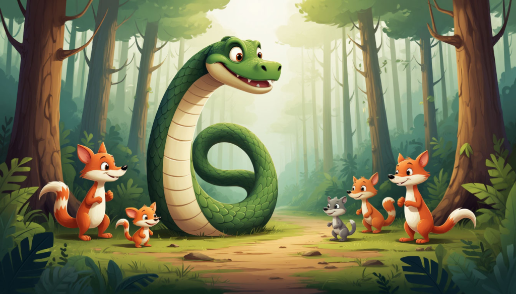 В самой густой чаще Изумрудного Леса, там, где лианы сплетались в природные гамаки, а солнце пробивалось сквозь листву золотыми иголками, жила необычная змея. Звали её Златина, и была она… очень-очень длинной. Не просто длинной, как удав, а невероятно, феноменально, до-смешного длинной.